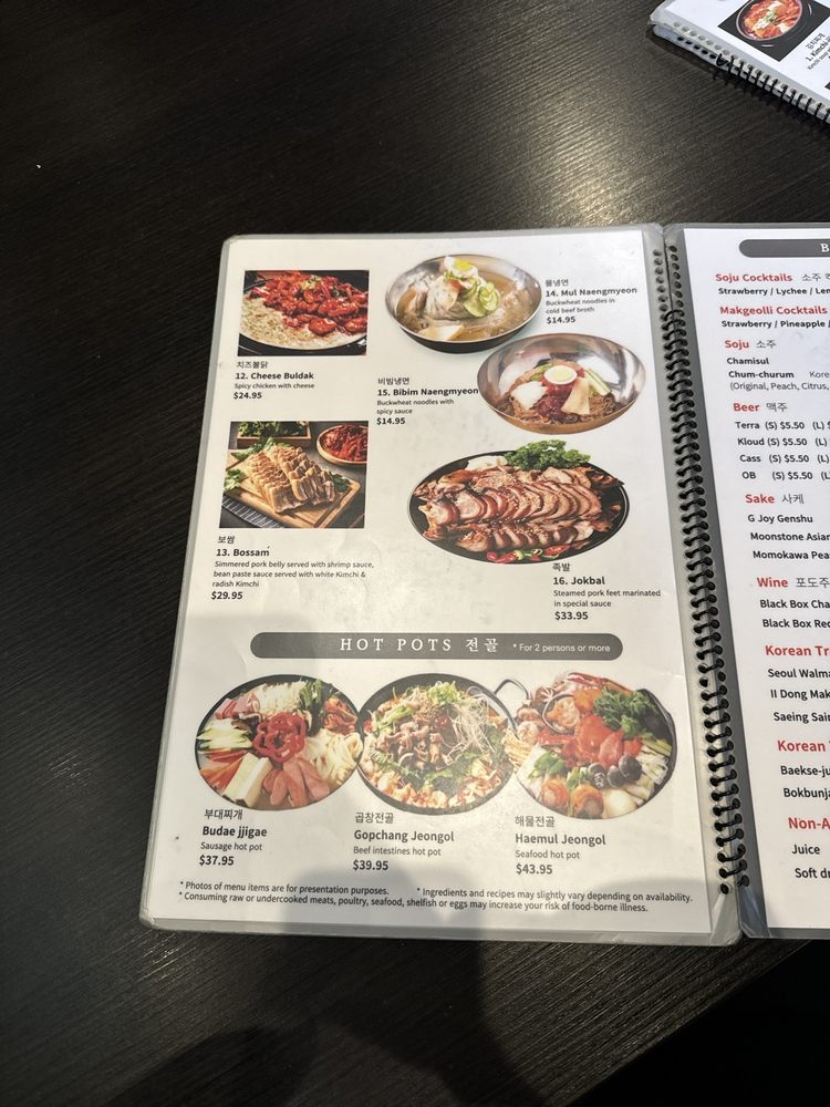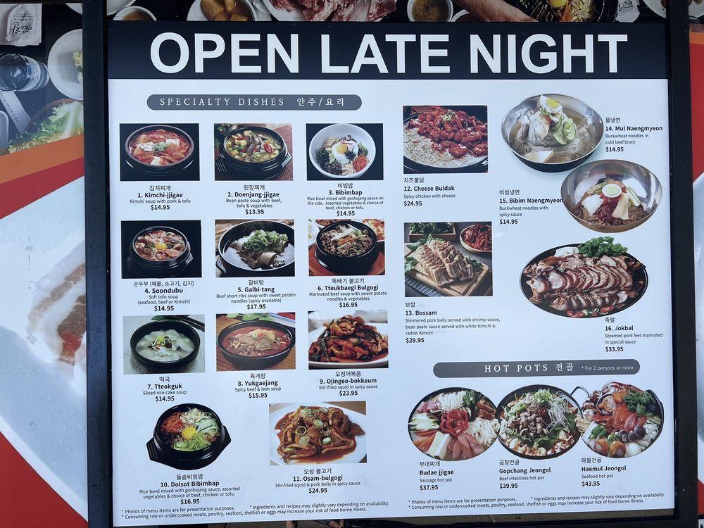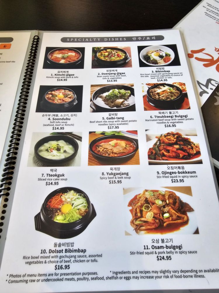 Special Combo (2 items):1. Soft tofu soup with choice of seafood, kimchi, beef or pork.2. Choice of traditional Korean-marinated beef, spicy pork, chicken or LA Galbi (beef cross-cut ribs) for additional $2.00.
